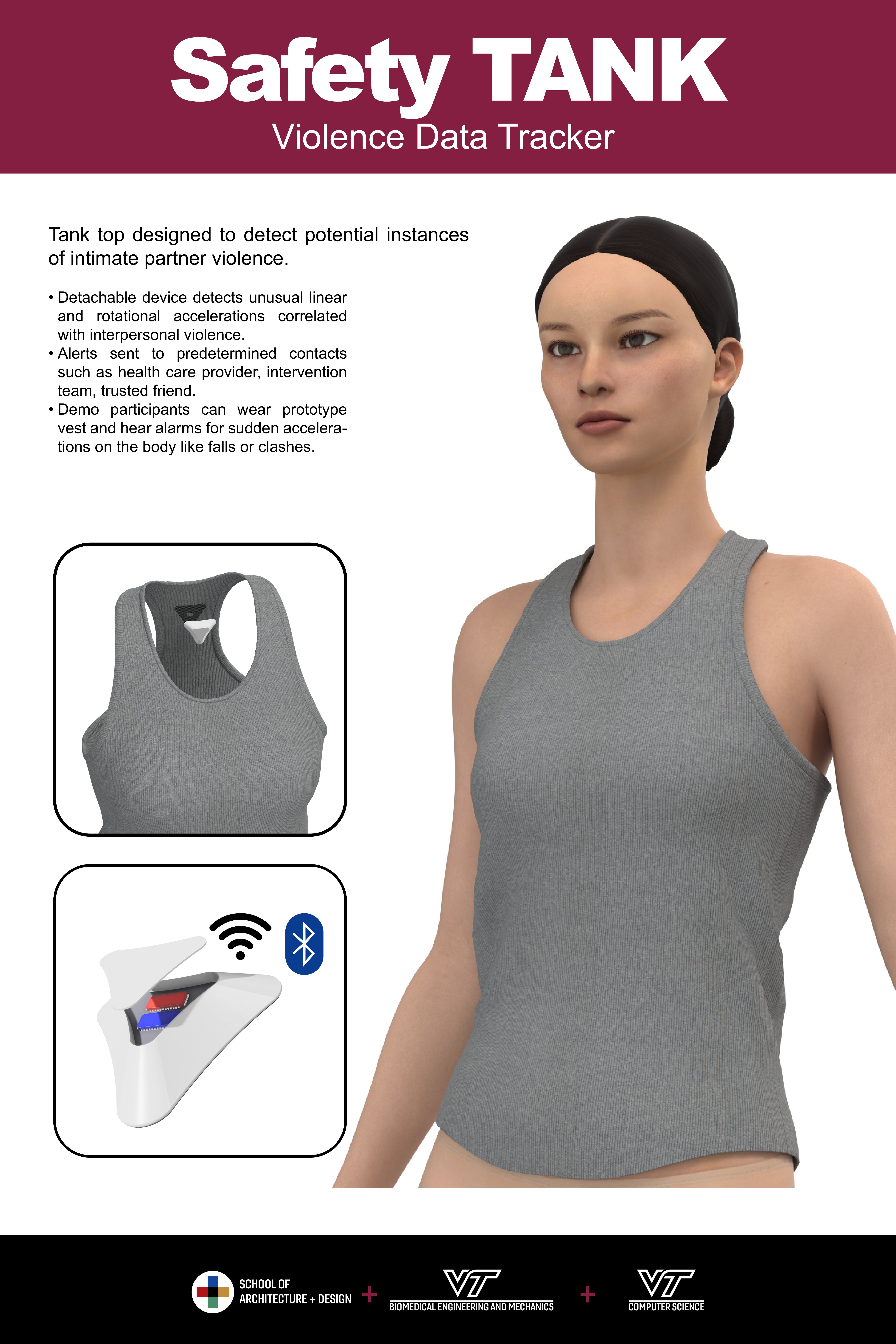 Abstract: 1 in 4 women experience intimate partner violence. Safety Tank, is a simple tank top with a detachable device created to detect unusual linear and rotational accelerations associated with interpersonal violence.